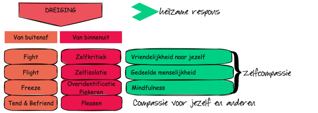 Zelfs wanneer we alleen maar streng zijn voor onszelf in onze eigen gedachten, ervaart ons lichaam dit als een dreiging. Onze innerlijke criticus activeert ons eigen gevaarsysteem. Zelfcompassie helpt ons om in plaats van het gevaarsysteem, het kalmeringssysteem aan te spreken wanneer we pijn of stress ervaren.