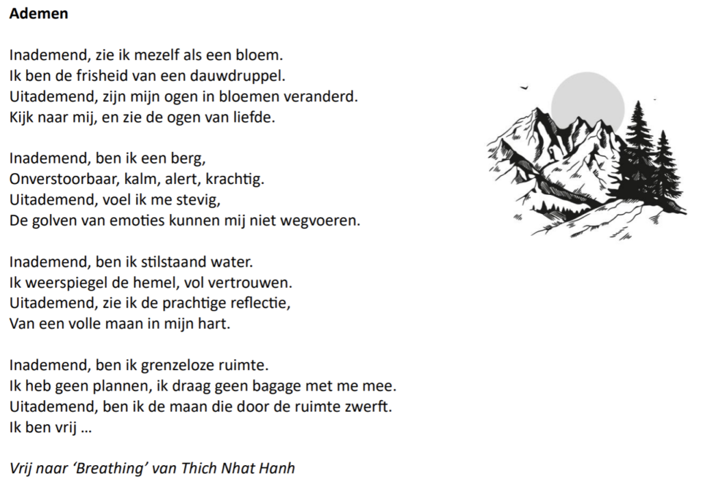 Toch merken we onze adem meestal niet op. Ze is er gewoon, zonder dat we erbij stilstaan. Daarom is een van de eerste dingen die we in de training oefenen: contact maken met de ademhaling. We gaan opmerken hoe de adem verandert bij onze gedachten, gevoelens en bewegingen. Het gaat er niet om dat je de adem controleert. Je hoeft alleen maar waar te nemen dat je ademt, en dit met een rustige en nieuwsgierige houding te voelen.